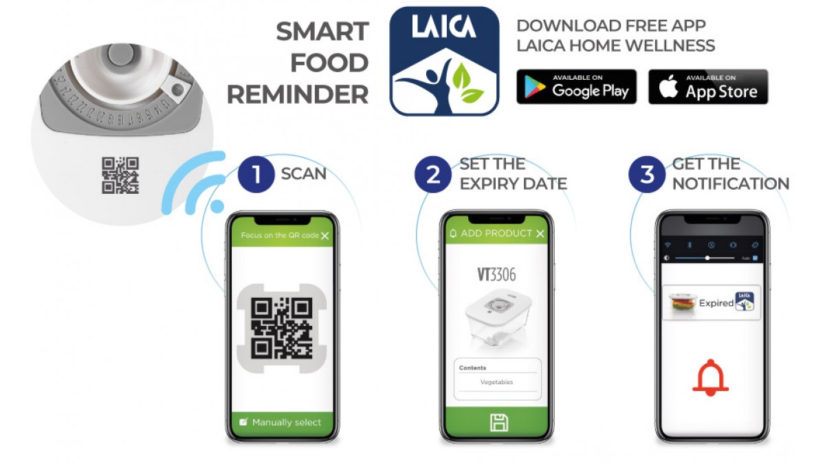 Cu aplicația gratuită Laica Home Wellness, puteți obține informații despre alimentele conservate și data de expirare a acestora pe smartphone.