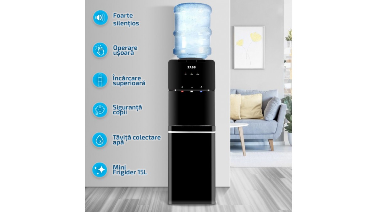 Bucura-te de apa atat de necesara hidratarii, indiferent de sezon. Acest dozator ZASS este conceput in asa fel incat sa-ti ofere apa rece, la temperatura camerei sau fierbinte, dupa nevoile tale si ale familiei tale. Pozitionarea spatiului tip minifrigider la baza il face foarte util in special in colective mici de oameni, gen angajati de la birouri, angajatii unor cabinete medicale, elevii unei clase etc. Astfel, poți savura snack-ul sau bautura ta preferata, pastrate la rece in interiorul minifrigiderului.