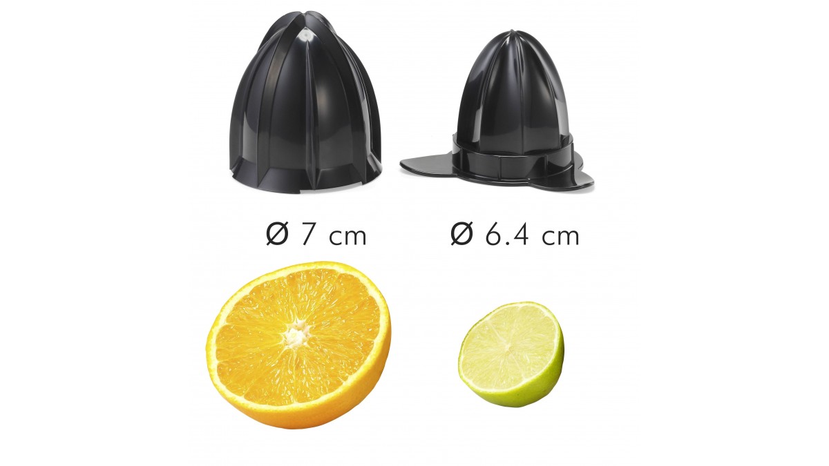 Contine 2 conuri de diferite marimi, pentru portocale si lamai(7cm si 6,4cm).