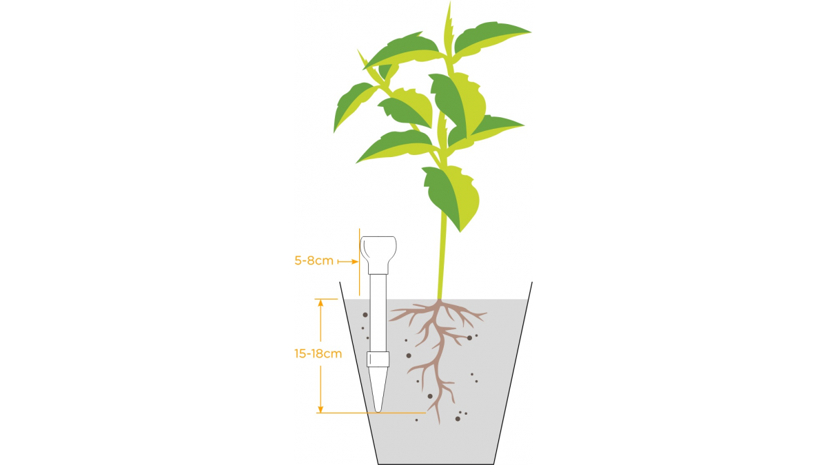 • Introduceți-l în sol la o adâncime de 15-18 cm în partea exterioară a rădăcinii plantei, iar plantele la ghiveci la o distanță de 5-8 cm de la marginea vasului.